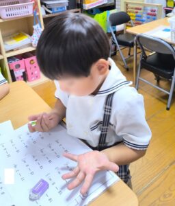 1時間目は40分近くありますが、年少さんでもしっかり座って最後まで計算やプリントに取り組むことができています。