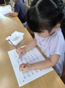 1時間目は40分近くありますが、年少さんでもしっかり座って最後まで計算やプリントに取り組むことができています。